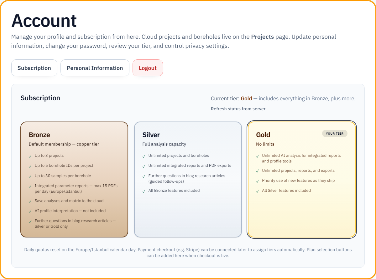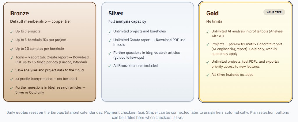 Bronze: All new members start here. Up to 3 projects, 5 borehole IDs per project, 30 samples per borehole. In each tool’s Report tab, completed Create report → Download PDF actions are limited to 15 per calendar day (Europe/Istanbul). Save analyses to the cloud. Analyse with AI in tools is not included. The Projects parameter matrix Generate report (AI engineering report) is Gold only and uses a separate weekly quota—not this daily limit. Further questions in blog research articles are Silver or Gold only.