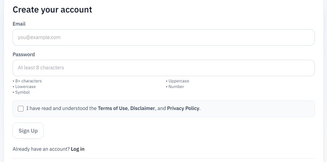 Click Account in the top menu to open /account. Use Log in to your account with email and password, or Forgot password? for a reset. If you are new, choose Register now. to switch to Create your account: meet the password rules, accept the legal terms, then Sign Up.