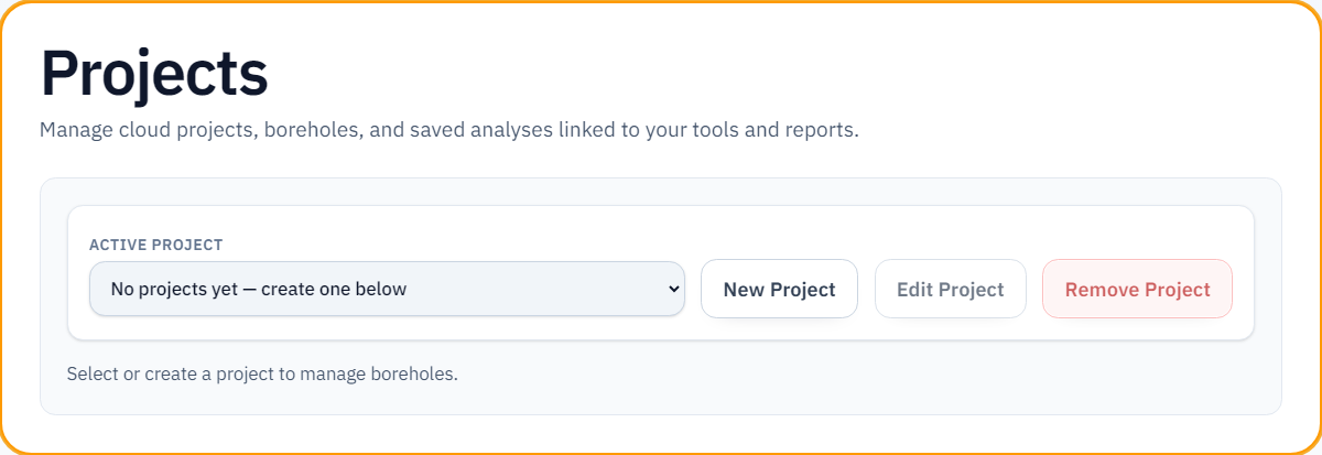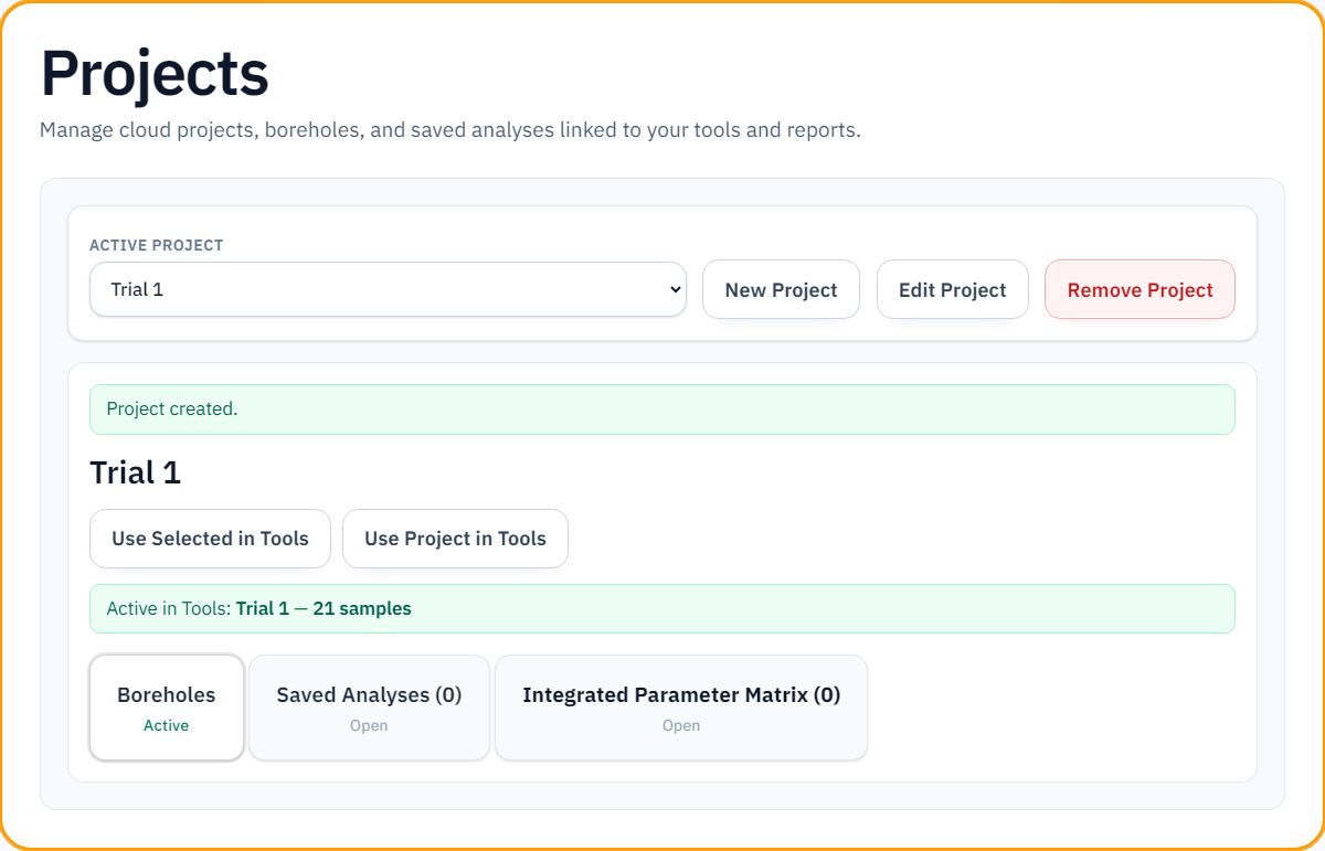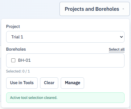 - On a tool page (/tools/…), open Projects and Boreholes in the header, select your project and boreholes, then click Use in Tools. Use Clear to detach project data.