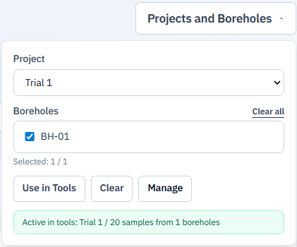 On tool pages (/tools/…), open Projects and Boreholes in the header, pick your project and boreholes, then click Use in Tools—samples are pushed into the tool’s profile rows automatically. Click Clear to detach project data and switch back to manual entry inside the tool.