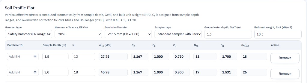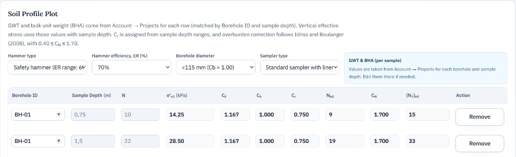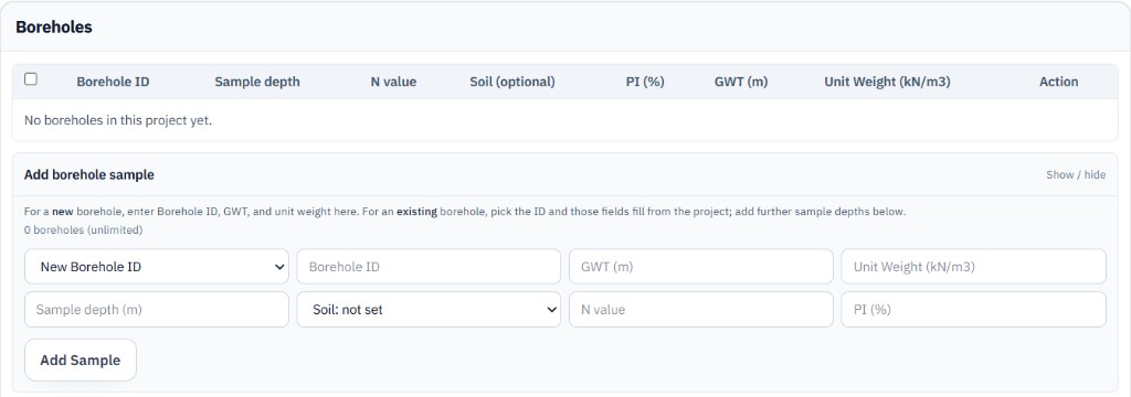 Under each project, open Boreholes to define boreholes and enter their key data (ID, GWT, unit weight, and sample rows). When you add another sample under an existing borehole ID, saved fields for that borehole load from the project automatically—you mainly enter the new sample-specific values (depth, N, PI, and so on).