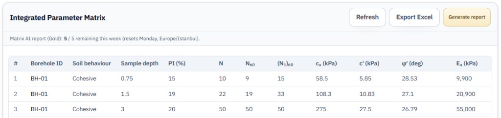 This screen (title on the app: Integrated Parameter Matrix) shows parameters merged from tool analyses saved to the project with borehole samples. Refresh and Export Excel are available where your plan allows. The gold Generate report button is Gold only: it runs a long AI prompt to produce an engineering report and may show a weekly allowance line. This is separate from the daily Create report → Download PDF limit in tools.