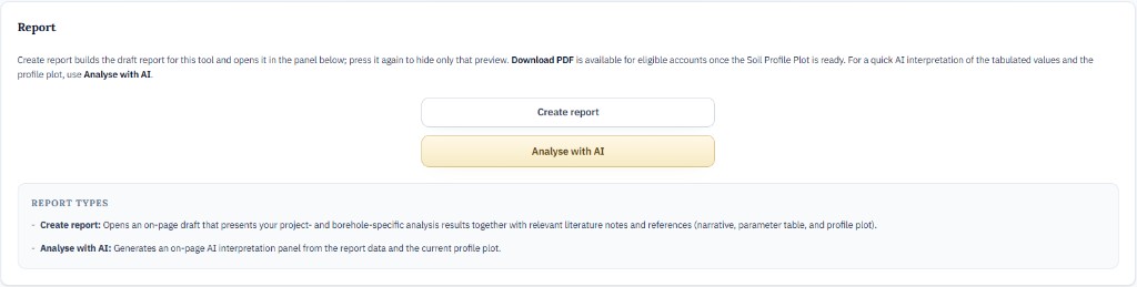 - Open the Report tab in the tool → Create report opens the draft preview. Download PDF is available for eligible accounts when Soil Profile Plot is ready; on Bronze, downloads count toward a daily allowance (separate from Projects → parameter matrix Generate report).