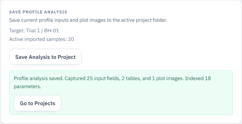 Profile tools also include a Save Profile Analysis / Save Analysis to Project control. It writes the current analysis into the project folder—input tables and plot images—so you can reopen and restore the work later. You must be signed in with an active project.