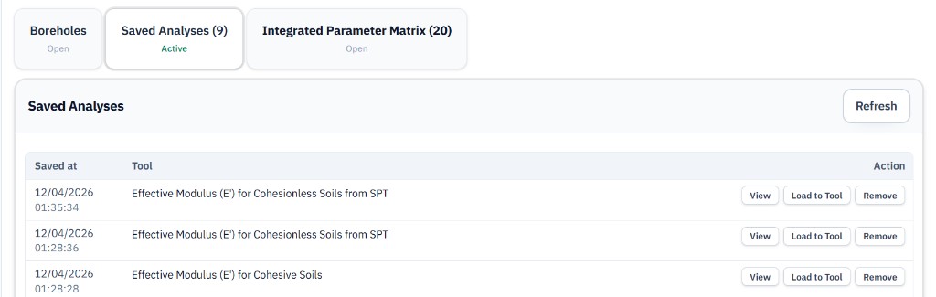 - Open Projects → choose your project → the Saved analyses tab. Each row offers View, Load to Tool, and Remove.