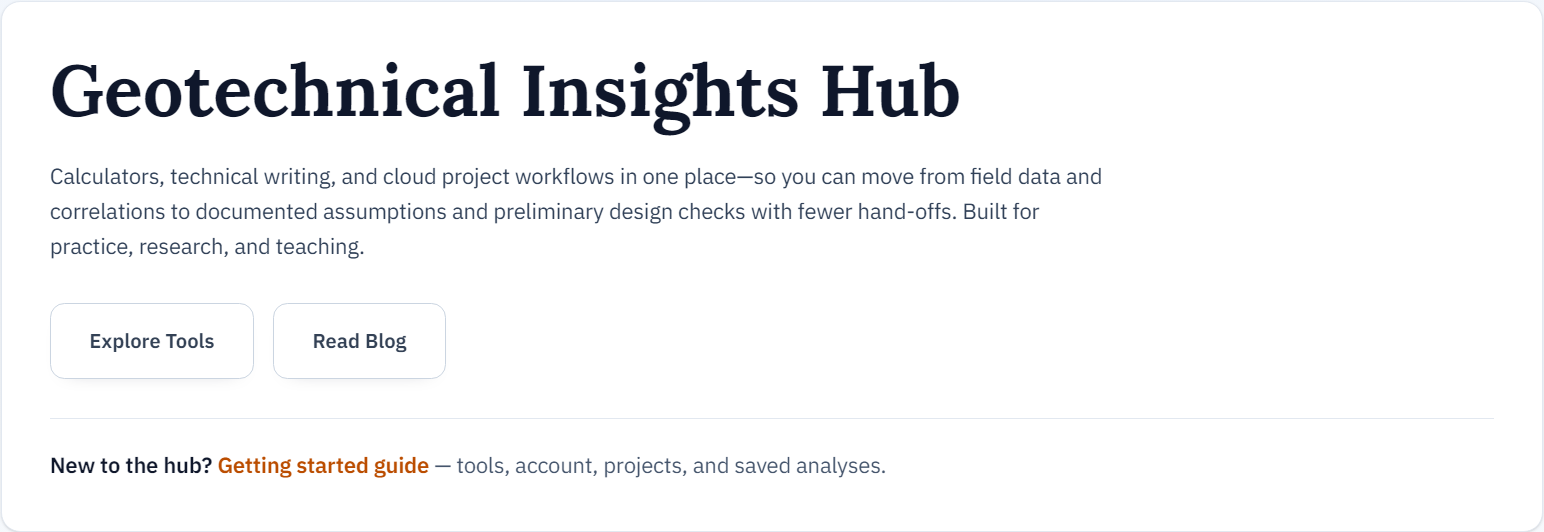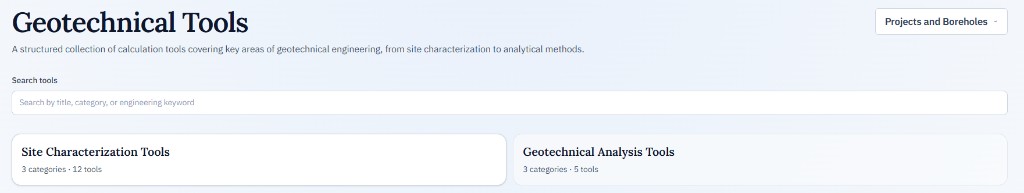 This guide explains how to use the tools on the site and where to find key sections. It walks through the typical workflow: account/project/borehole management, using project data in tools, saving results, viewing plots, and exporting reports.