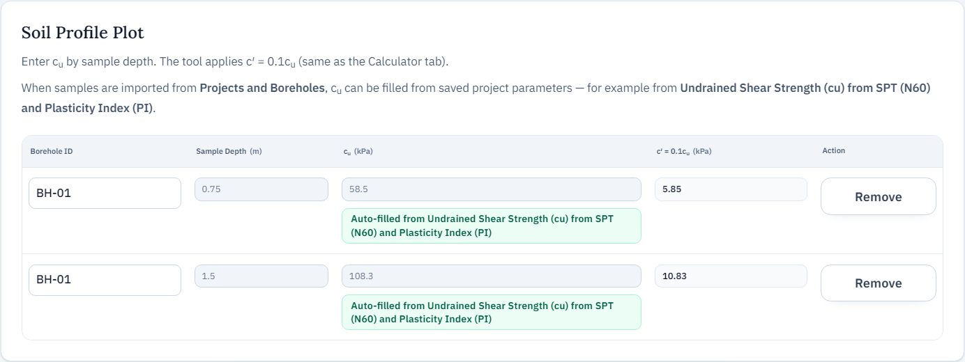 With project data: Select a project and boreholes from the header. In profile tools, each row can be matched to your project data via borehole ID and sample depth. Soil behaviour stored under Projects may affect whether a row is eligible in some tools (restricted rows may appear disabled).