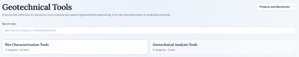 Tools available on the site are grouped into two main categories: Site Characterisation Tools and Geotechnical Analysis Tools. In the screenshot below, each group is highlighted on its card at the bottom of the page.